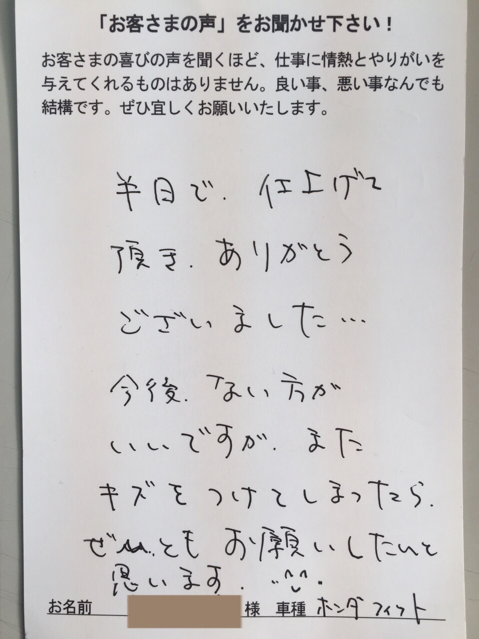 半日で、仕上げて頂きありがとうございました・・・今後、ない方がいいですが、またキズをつけてしまったらぜひともお願いしたいと思います。(^-^)